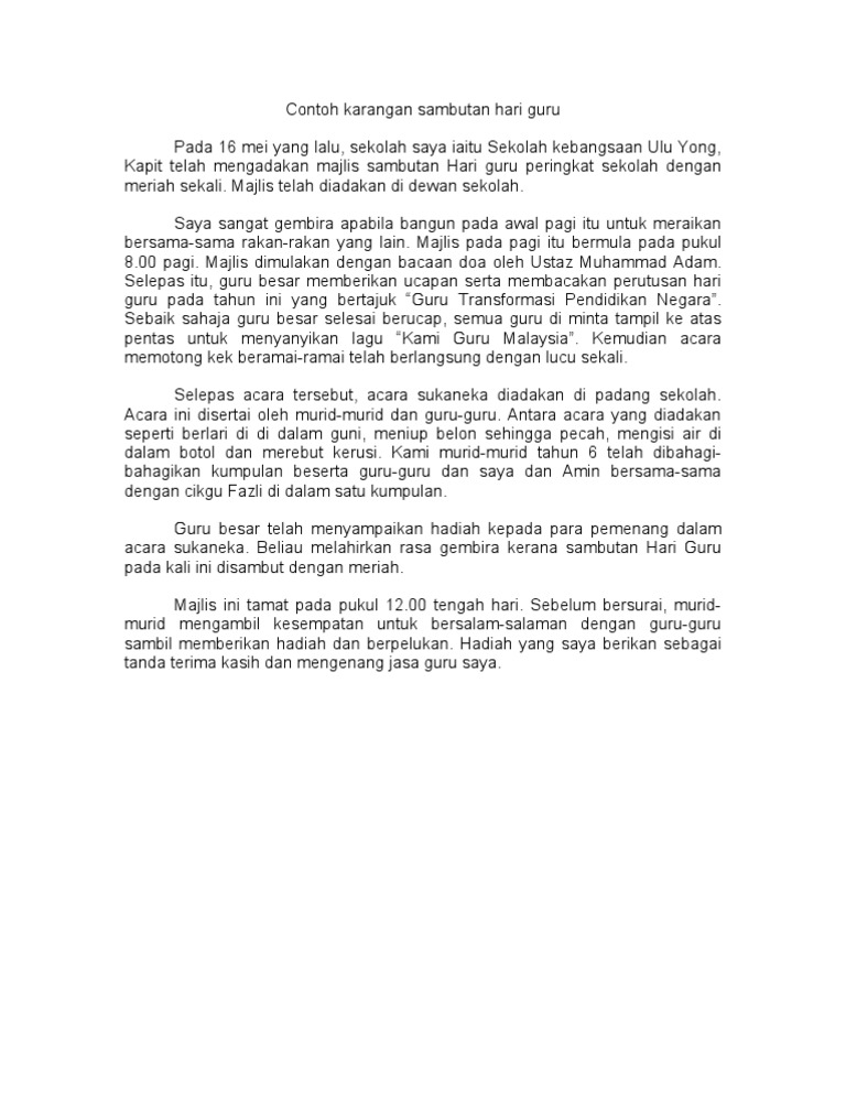 Sambutan ini bertujuan menghargai dan memartabatkan jasa para guru. Anda boleh menggunakan contoh karangan di bawah sebagai panduan untuk membantu dalam penulisan karangan bahasa melayu. Contoh karangan sambutan hari guru Pada 16 mei yang lalu sekolah saya iaitu Sekolah kebangsaan Ulu Yong Kapit telah mengadakan majlis sambutan Hari guru peringkat sekolah dengan meriah sekali.